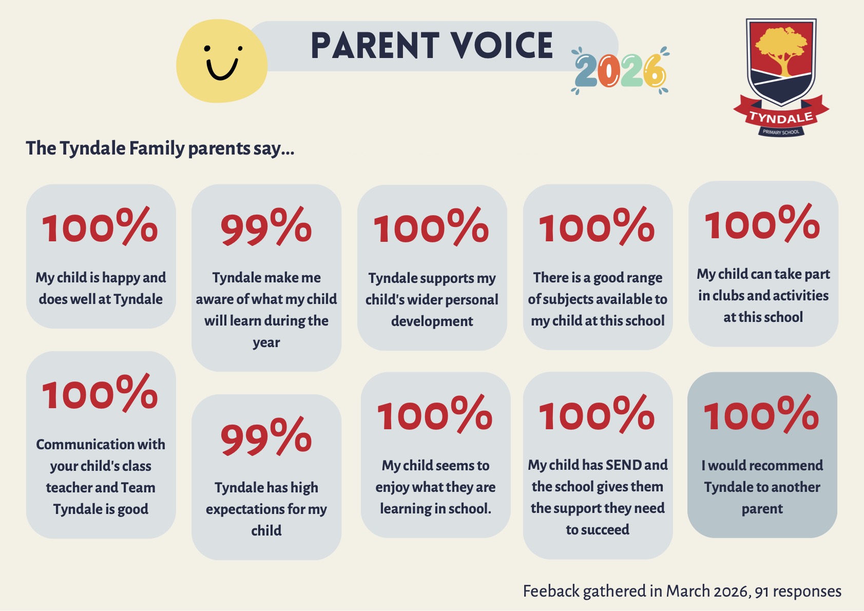 - 98% of our parents believe that their child is happy at Tyndale